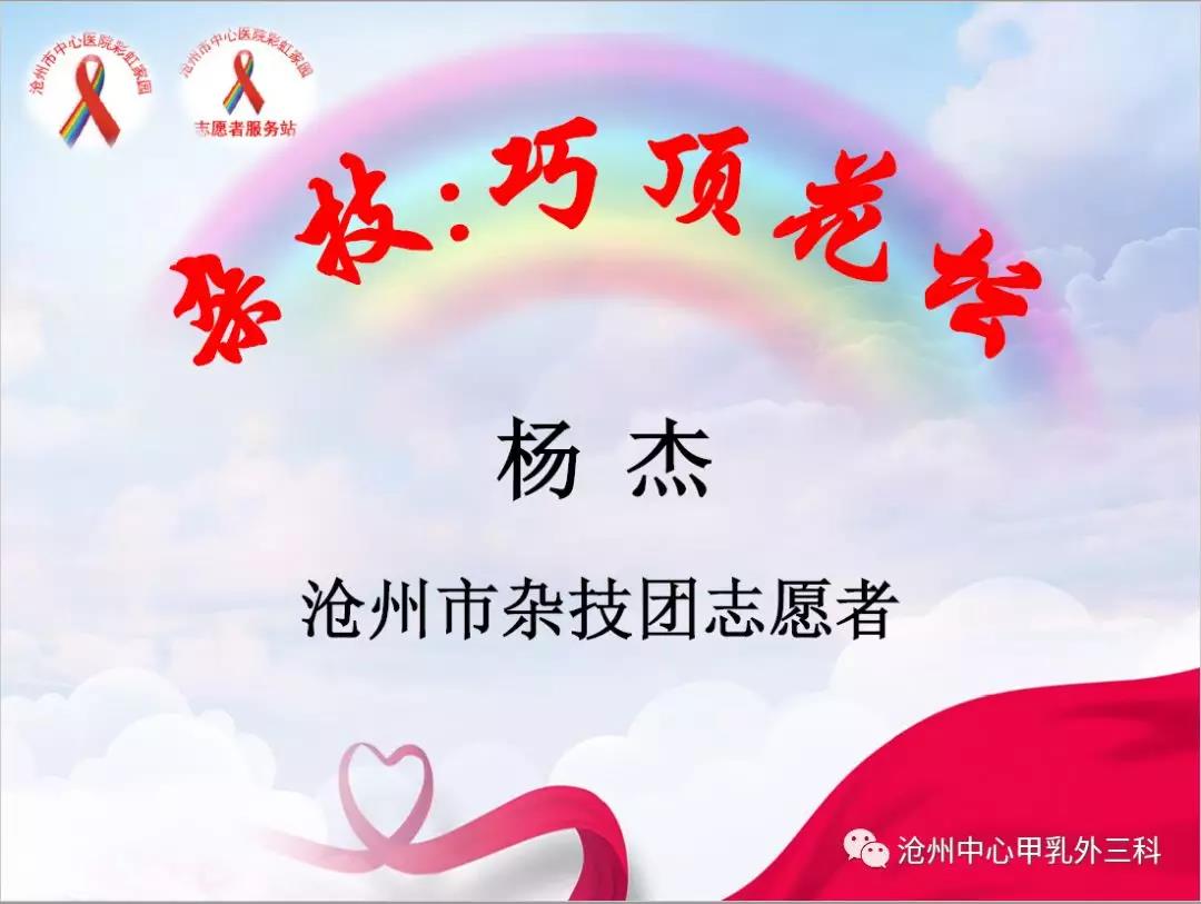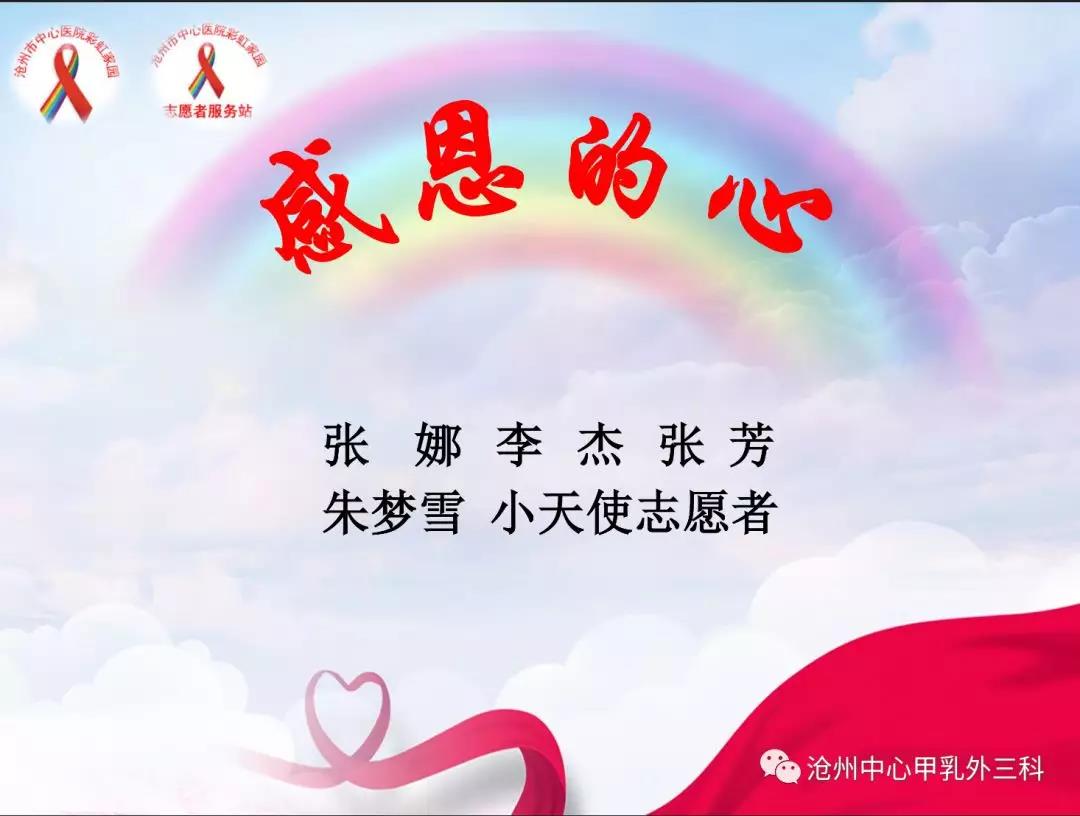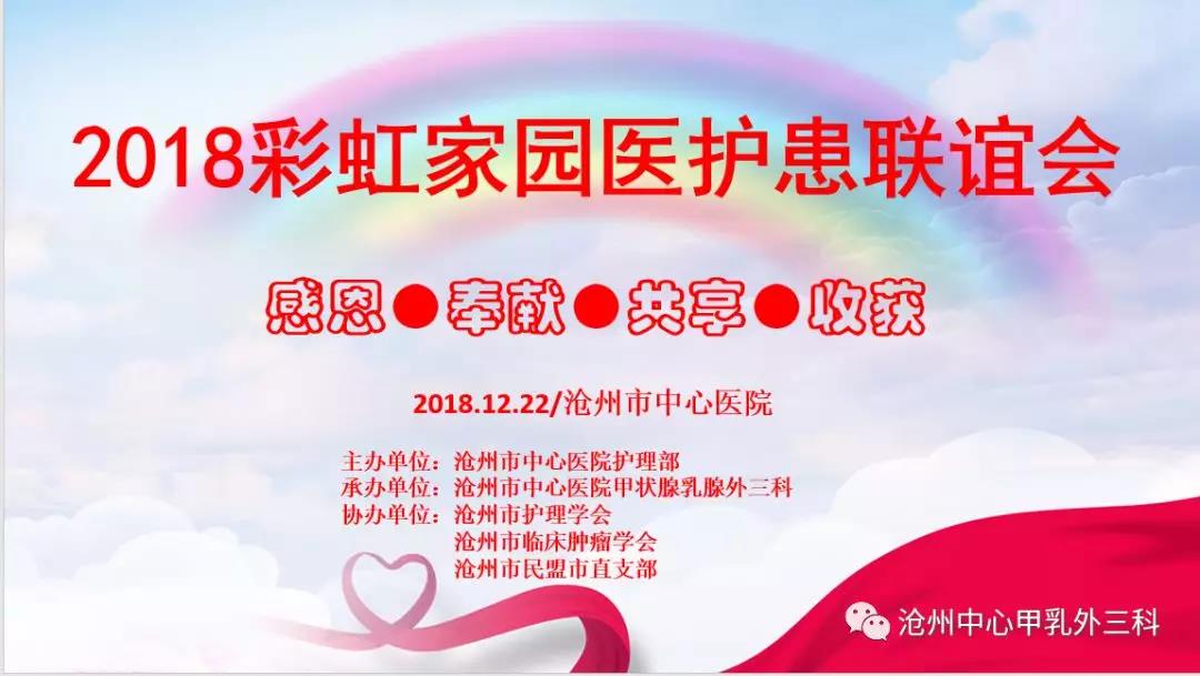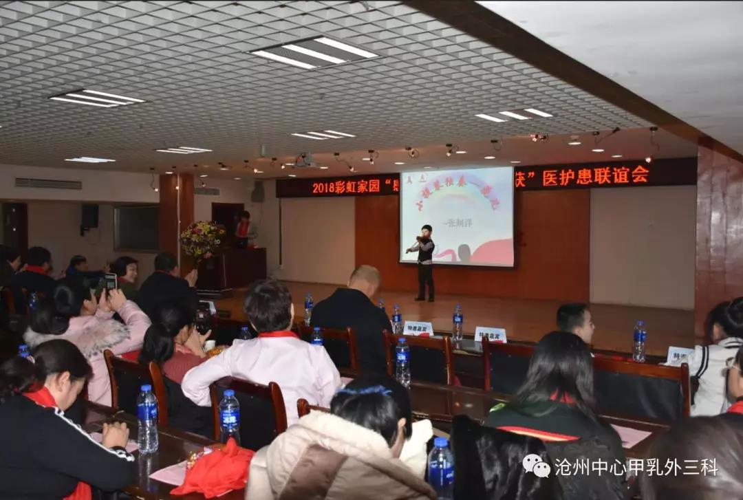 2018.12.22沧州市中心医院甲乳外三科第一届彩虹家园医护患联谊活动圆满结束,感谢院领导的大力支持,感谢社会志愿者的爱心捐赠,感谢彩虹家园的家人们的积极参与,感谢大家的共同努力,祝我们的家园越办越好!